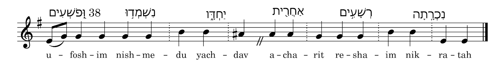 Note this bi-colon has no rest on the subdominant (A) but only the rest on the supertonic (on the first note of bar 5). The music perhaps signals that there is no complete rest until the poet's "steps are established". There are 45 verses in the Psalter that have this limited structure.